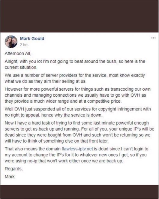 They haven't been taken down but they are having major issues with their infrastructure ( not for the first time ). its going to take a brave person to renew with Flawless if in fact they have a month by month subscription right now because since the tail end of 2017 they've had nothing but problems.
